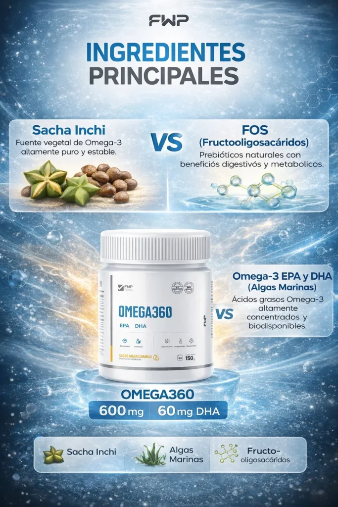Su Omega-3 (EPA y DHA) proviene del Sacha Inchi y de Algas Marinas. Además, contiene fibra como Inulina y FOS.
